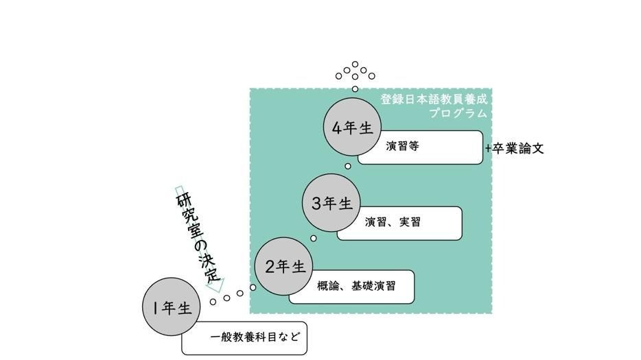 東北大学文学部には、26の研究室があり、その中の1つ日本語教育学研究室で「登録日本語教員養成プログラム」が運営されています。学生たちは、文学部の学生として入学し、2年生になる際に研究室に配属され、専門が決まります。研究室に配属されると同時に、「登録日本語教員養成プログラム」が始まり、3年生後期の実践研修に向けて科目履修を進めていきます(図1)。