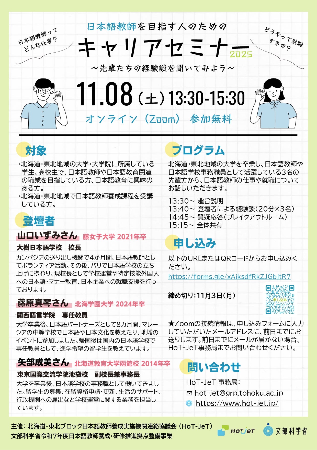 今回は、北海道・東北地域の大学を卒業し、日本語教師や日本語学校事務職員として活躍している3名の登壇者に、仕事や就職についてお話しいただきます。