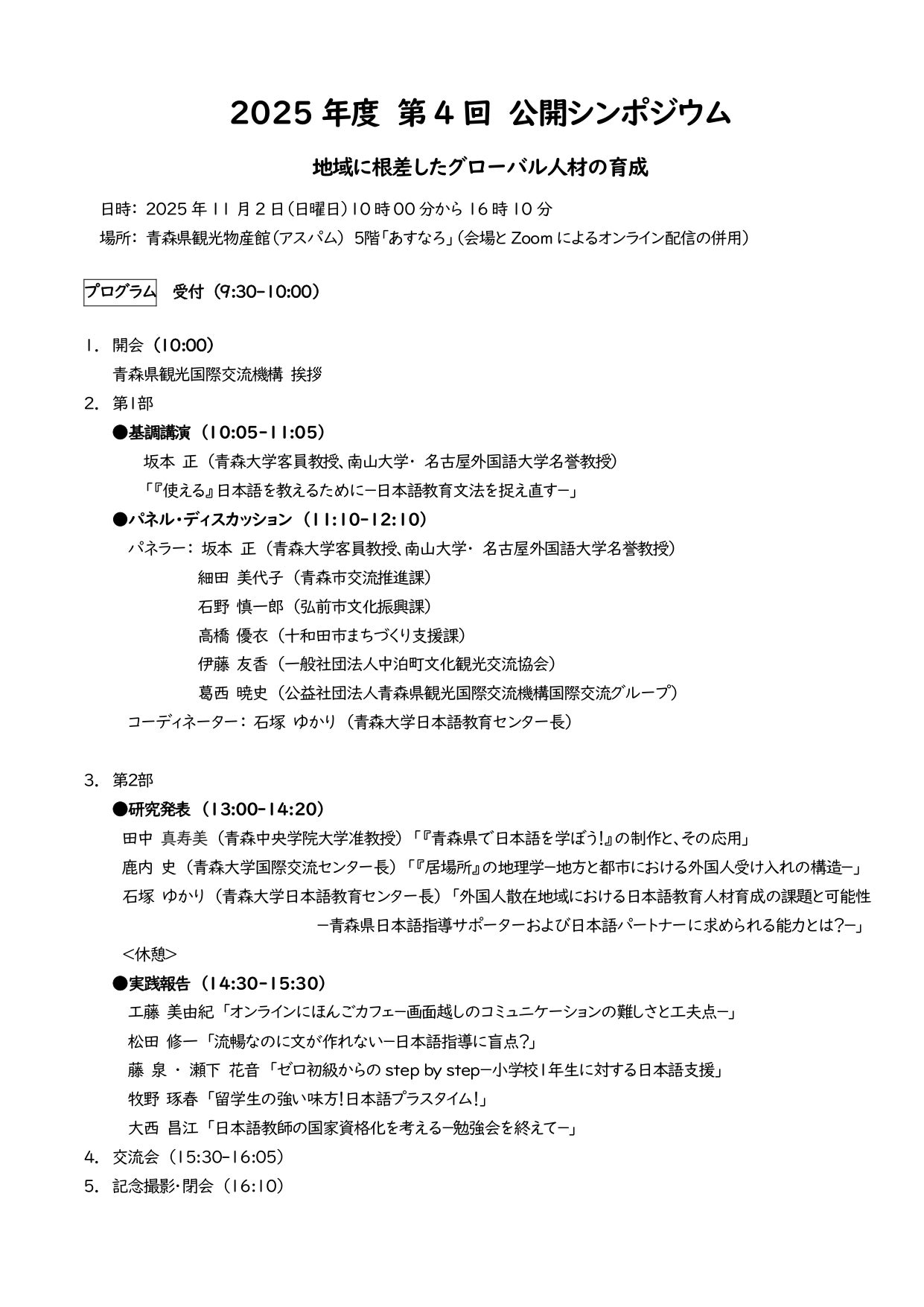 グローバル人材の育成を目指した教育に関する研究発表、青森県内で日本語教室や子どもの日本語支援、国際交流活動などで活躍中の方々の取り組みに関する実践報告を行います。