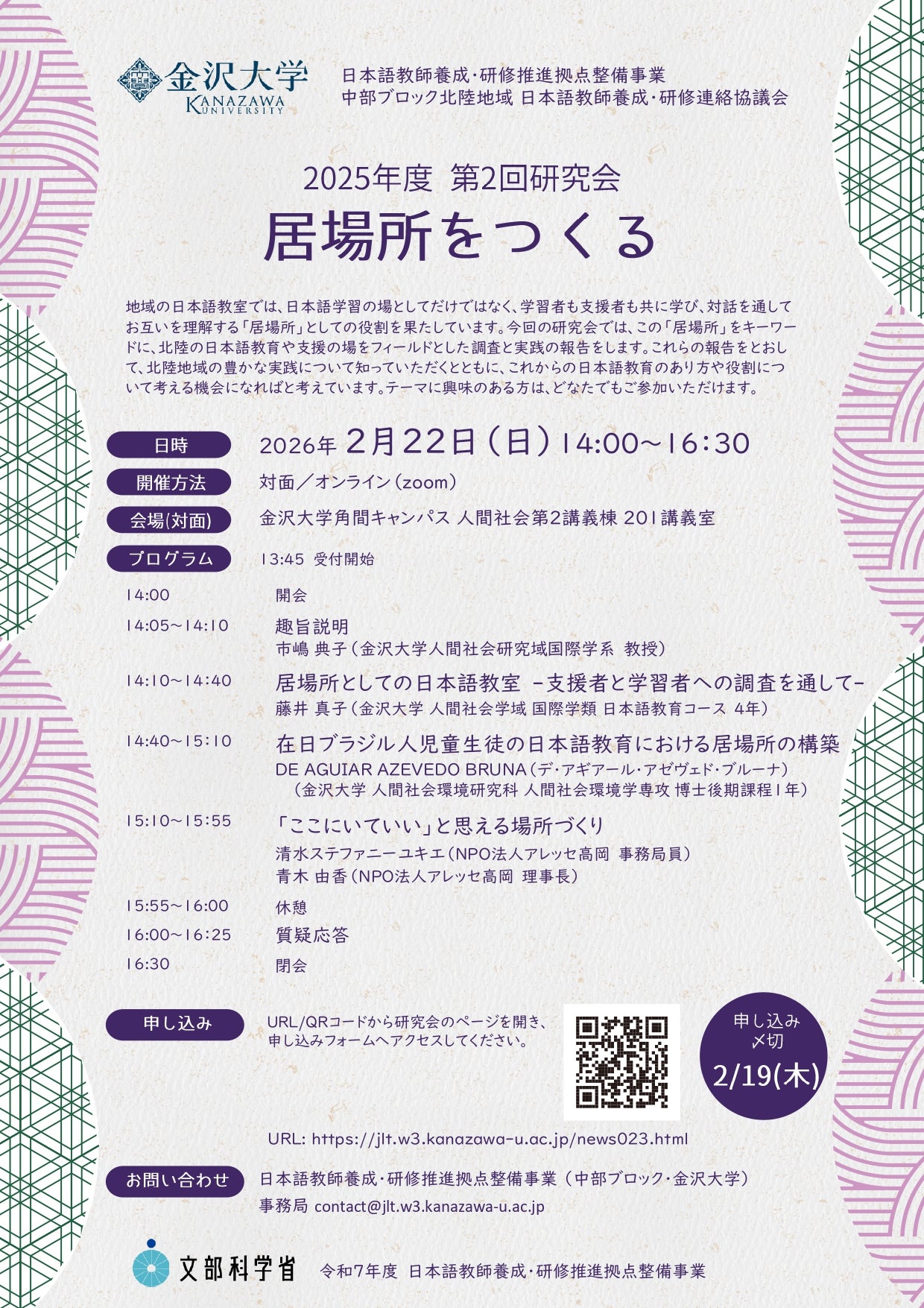 日本語教師養成・研修推進拠点整備事業中部ブロック金沢大学2025年度 第2回研究会「居場所をつくる」開催案内