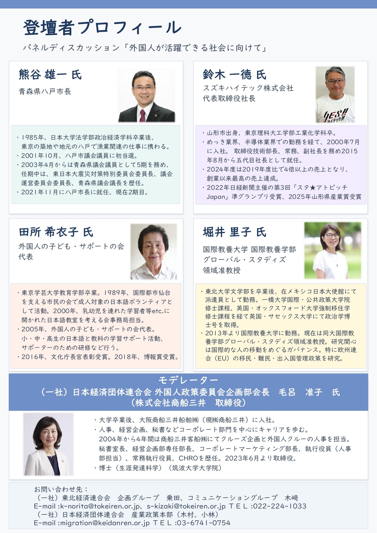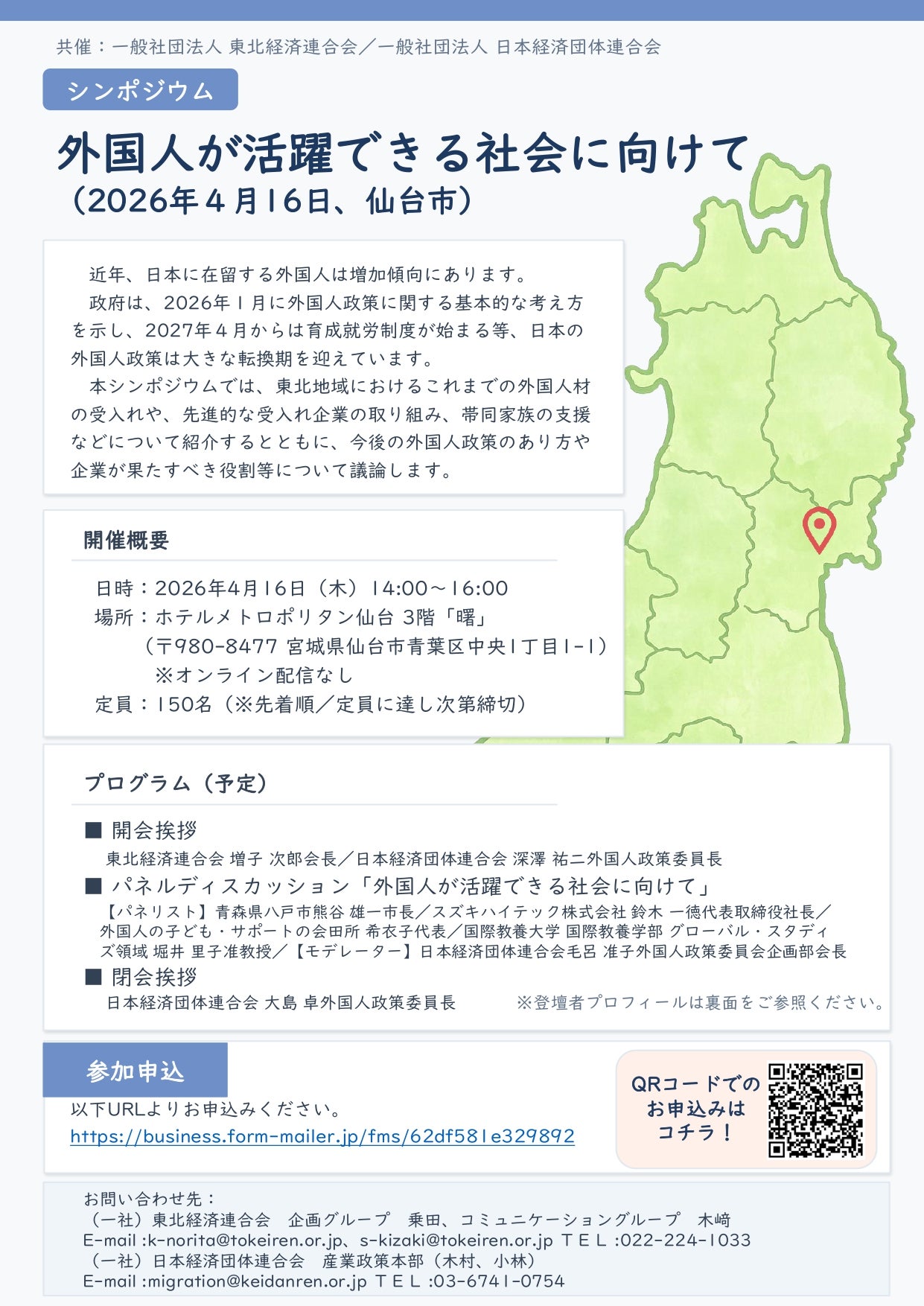 本シンポジウムでは、東北地域におけるこれまでの外国人材 の受入れや、先進的な受入れ企業の取り組み、帯同家族の支援 などについて紹介するとともに、今後の外国人政策のあり方や 企業が果たすべき役割等について議論します。